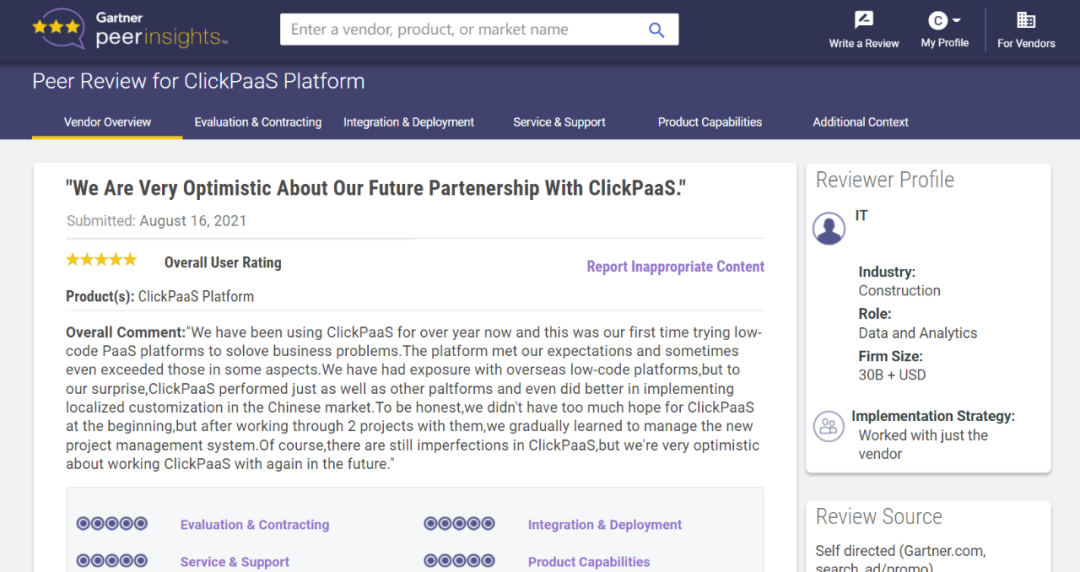 Tips::::【Peer Insights】——用户对企业IT产品和服务发布真实评价的平台。。目前已有355个市场,,255,000条经过验证的评价。。每一条评价Gartner会针对参评企业营收规模及参评人员信息做验证、、、、评价内容做多维核实。。